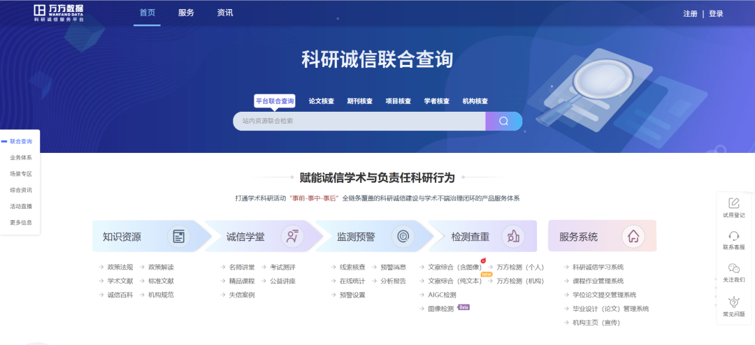 万方数据科研诚信服务平台,通过打通学术科研活动“事前-事中-事后”全链条覆盖的科研诚信建设与学术不端治理闭环的产品服务体系,赋能诚信学术与负责任科研行为。
