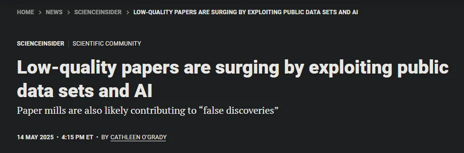 《Science》2025 年的一则报道,将全球学术不端的疮疤再次揭开。萨里大学《科学报告》副编辑、统计学家马特・斯皮克直言:“我收到了很多几乎相同的论文——一天一篇,有时甚至是两篇”。NHANES 公开数据集的数据显示,2023-2025年间创作的低质量论文数量相较以往激增47%。论文工厂已形成“数据获取-AI生成-期刊投稿”的完整产业链,而科研评价体系中的“唯论文”导向正是滋养这一生态的土壤。
