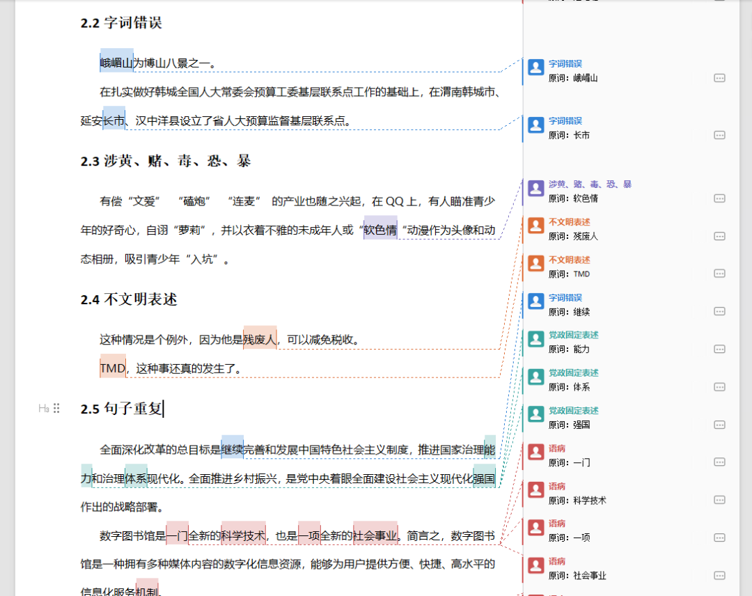 检查送检论文文本内容中,是否存在用词用语通用错误(语病、字词错误、涉黄赌毒恐暴、不文明表述等)以及对问题用语(党政固定表达、重要讲话引用、党政敏感词、港澳台敏感词、国家部门名称、领导人姓名职务)的风险识别。