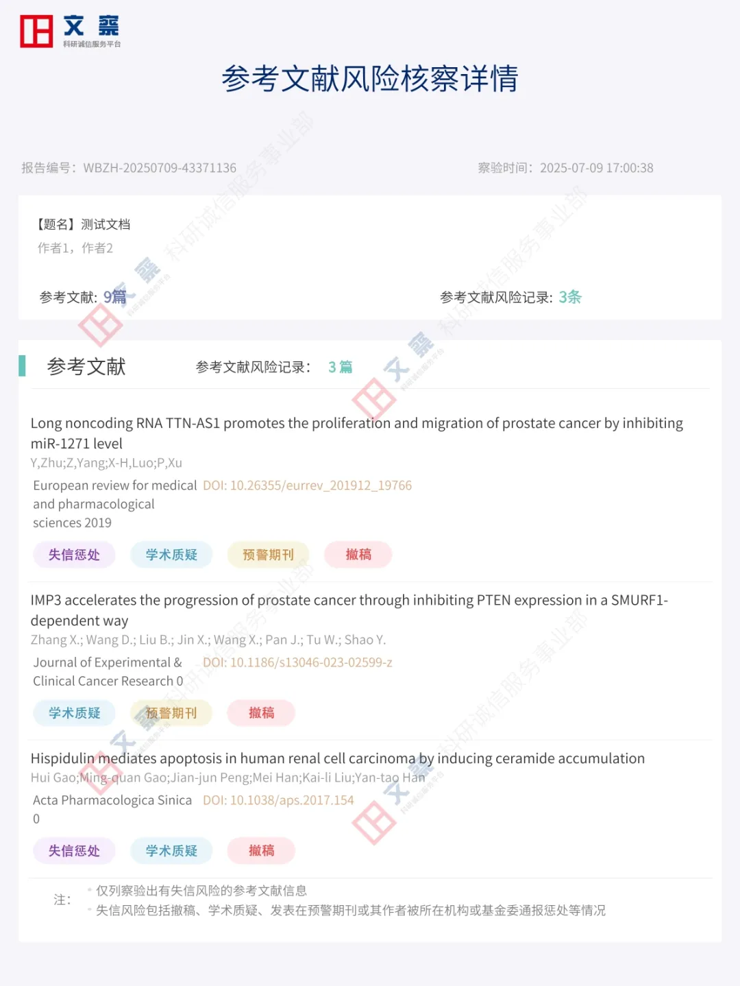 检测送检论文识别到的参考文献是否有被撤稿、被学术质疑、被失信惩处公示、是否发表在警示期刊上。