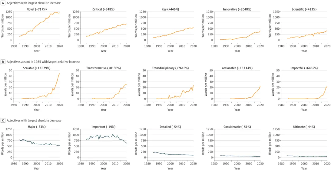 在对 901717 篇摘要进行分析后,研究者将 139 个形容词定义为炒作(Hype)式语言。有 130 个形容词的频率增加了近14倍(1378%),9 个形容词的使用频率减少了 44%。其中“novel”(新颖性)的使用次数增量最大,为 1054wpm(words per million);“critical”和“key”两个强调关键性的单词使用次数也分别增加了 555wpm和 461wpm。“sustainable”(可持续的)、“actionable”(可操作的)、和“scalable”(可扩展的)三个形容词的使用频率则分别上升了 25157%、16114% 和 13029%。