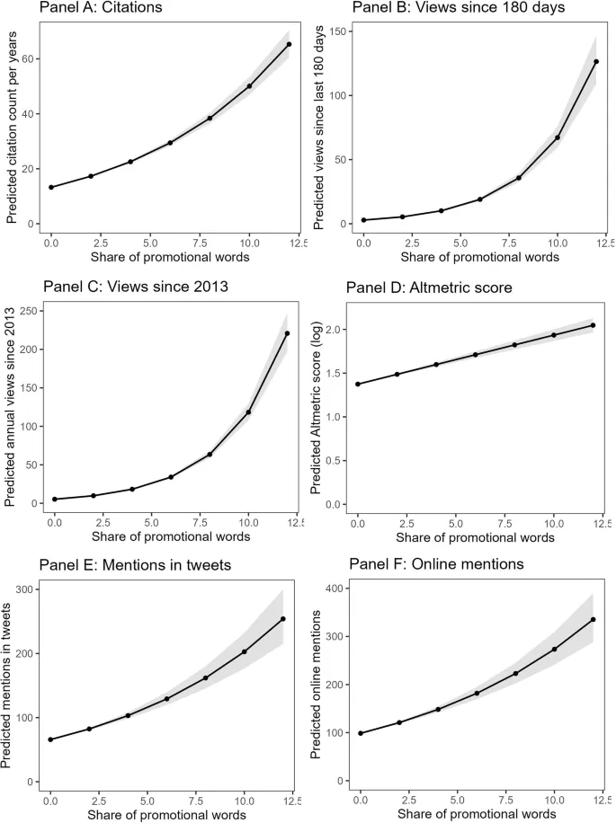 在统计模型预测下,研究结果显示:每增加 1% 的宣传语言(约 2 个宣传词),年引用次数增加 9-14%、过去 180 天内论文访问量增加 14-37%、总体在线关注度增加 5−11%。以样本平均值为例,一篇每年引用次数为 15 次且已发表 16 年的论文,在摘要中添加 2 个宣传词就有几率使文章额外增加 33.6 次引用。