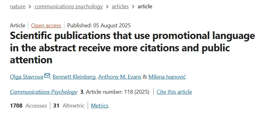 [2] Scientific publications that use promotional language in the abstract receive more citations and public attention - Communications Psychology