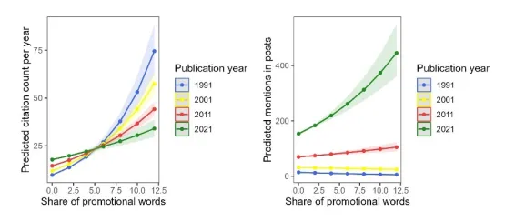 这种措辞手法对学术影响力的提升并非一劳永逸:在衡量论文深层学术价值的引用次数上,炒作的有效性正在下降。读者们可能已经对过度宣传产生审美疲劳或提高了警惕性,更倾向于基于实质内容来判断论文的长期价值。然而对于现代和社交媒体指标,炒作的效果随着时间推移反而增强,这种语言更能吸引关注并引发网络传播。