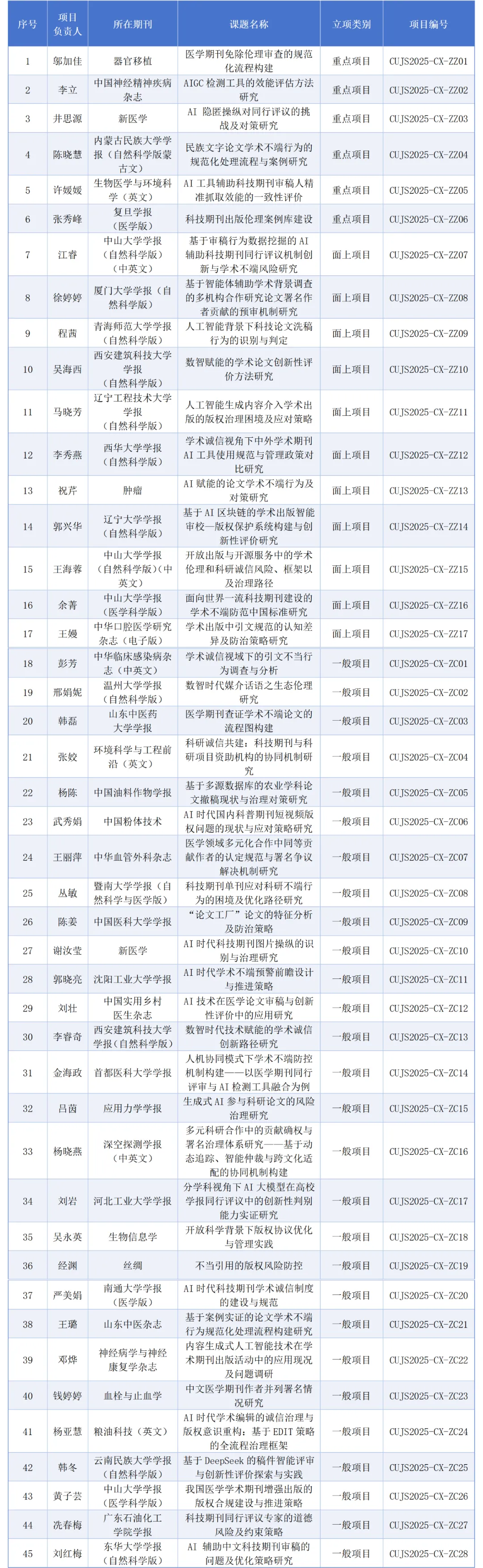 中国高校科技期刊研究会与万方数据联合设立“中国高校科技期刊研究会—万方数据学术诚信与版权专项基金”,截至2025年8月15日,共收到55份申报书,经资格审查、专家外审、专家组终审环节,最终45项获得立项。其中,重点项目6项、面上项目11项,立项后获得课题启动经费500元,结题验收合格后获得经费500元,研究成果被评为优秀再获得经费500元;一般项目28项,自筹经费。具体立项名单详见附件。获得立项的基金项目将在2025年11月10—11日于广东省珠海市举办的“学术诚信日”学术活动上予以公布并颁发证书。