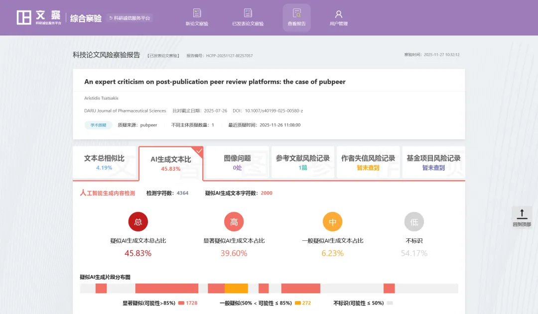 期刊收录的论文也不乏“幻觉式引用”的情况。11 月 13 日,发表在期刊 DARU : journal of Faculty of Pharmacy 的文章《对发表后同行评审平台的专家批评:以 PubPeer 为例》称类似 PubPeer 等平台因其开放性“易被滥用”,容易导致过度怀疑和批判行为的增加。