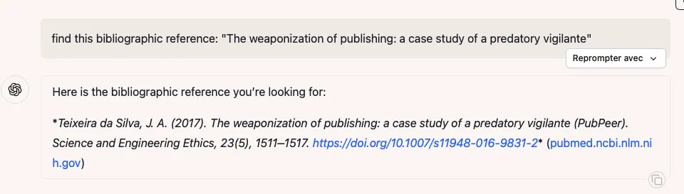 在 PubPeer 的评论区,有人通过提示词让 ChatGPT 再次生成了与文章引用的虚假文献几乎一致的引文信息,指出 AI 工具完全能够根据用户需要虚构用于佐证文章观点的文献。虽然论文作者在致谢中声明“用 AI 工具辅助部分语言编辑,但发表前已审核内容”。不过无论从文章的引用情况还是遣词造句来看,显然作者并没有像自己声明的那样仔细阅读并核实了文章内容,AI 工具也深度参与了这篇文章的创作。